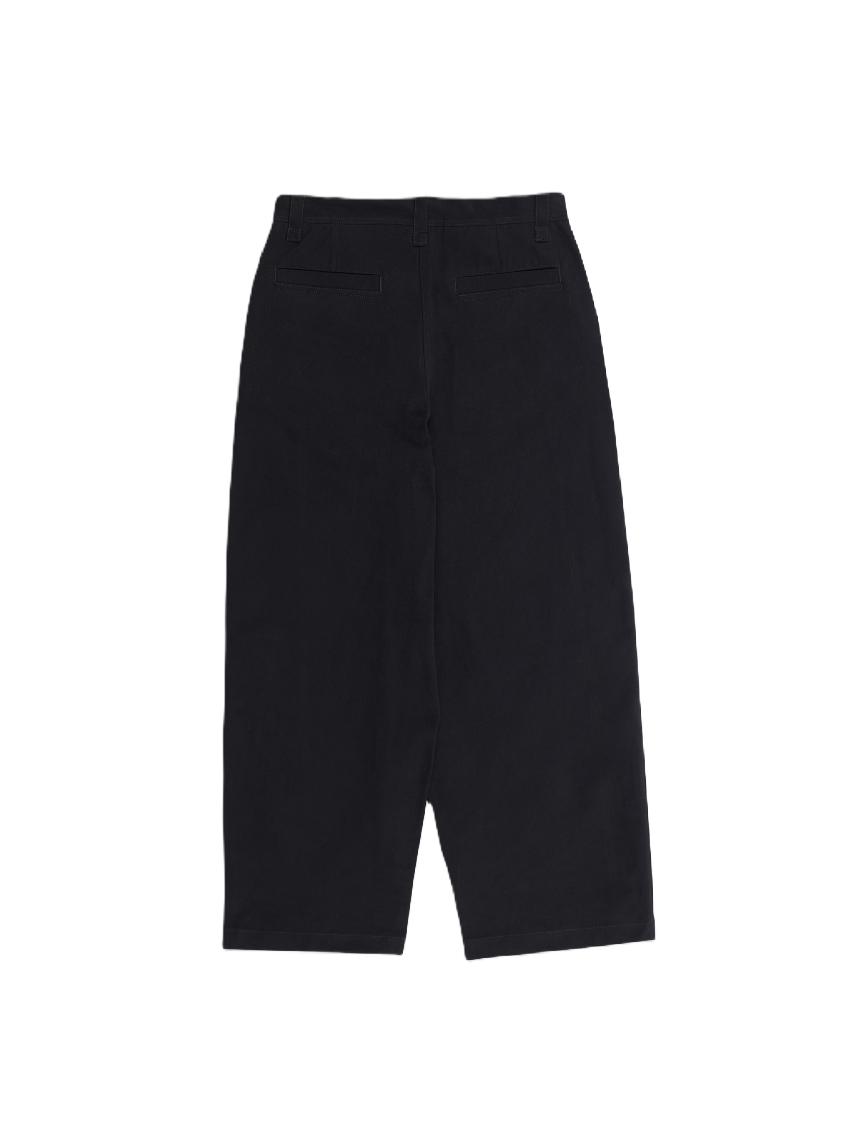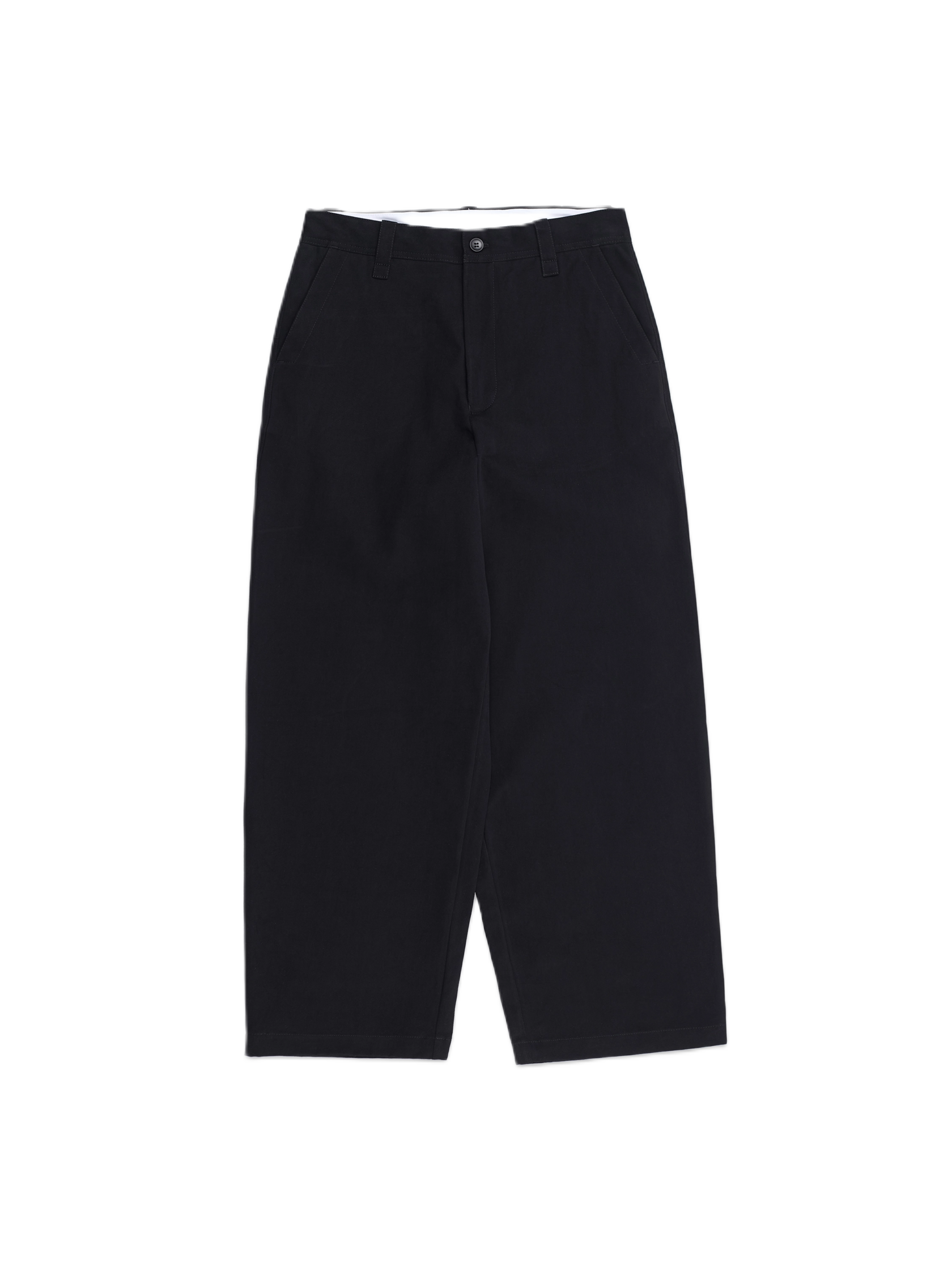 Брюки прямого широкого кроя из хлопковой ткани твил. Плотность ткани 320 г. Брюки оснащены двумя боковыми карманами и двумя задними прорезными карманами. Застежка на молнии марки SBS + пуговица. Корсаж и подкладка карманов выполнена из белой хлопковой ткани.